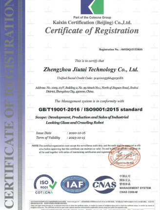 Zhengzhou JiuTai Technology Co.ltd. is a high-tech enterprise specializing in research and development, production, sales of endoscopes in the industrial and providing customized solutions for customers , established in 2010. Our company focuses on the international high industrial technology,up to now company apply for more than 60 patents,many technology are in the leading position in the world. Get the certificate of high-tech enterprises in 2016. At same time company registrated many software copyrights.